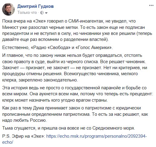 Минюст разослал черные метки "иноагентам" (а закон еще не вступил в силу). https://www.facebook.com/dgudkov/posts/1752901861417913 …pic.twitter.com/pluQHTUoKV