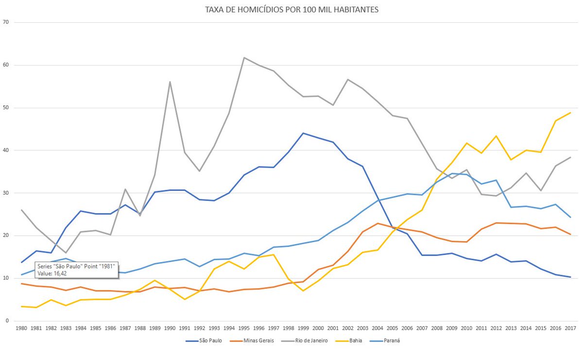 "Não, porque 297 anos de PSDB no governo" "Não, porque o Tucanistão" "Hahahaha, paulista não sabe votar" Vem com o tio. Homicídios por 100 mil habitantes nos 5 estados mais populosos do Brasil (fonte: Atlas da Violência)pic.twitter.com/IuEr4FnA9c