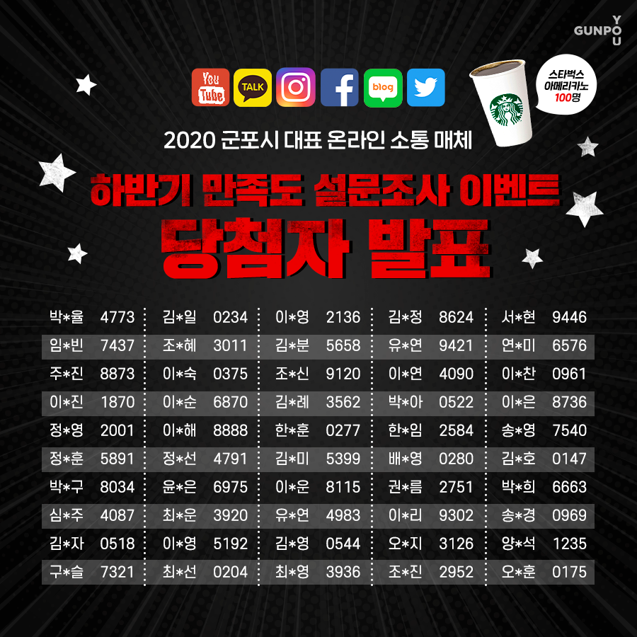 2020년 한해를 돌아보며 준비한 군포시 대표 SNS 하반기 만족도 조사 이벤트 당첨자 발표