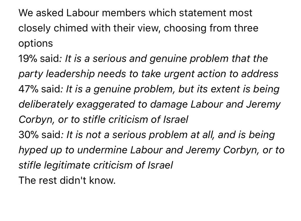 KEY FINDING: Only 19% of Labour members think there is a genuine antisemitism problem. 77% think the extent of antisemitism in Labour is being deliberately exaggerated to hurt Jeremy Corbyn or stifle criticism of Israelpic.twitter.com/nTHHB3OsAq