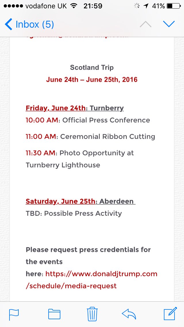 Herewith the itinerary of Donald J Trump's forthcoming trip to Scotland. He'll be cutting a ribbon. Ceremoniously.pic.twitter.com/J6ifIsuuvm