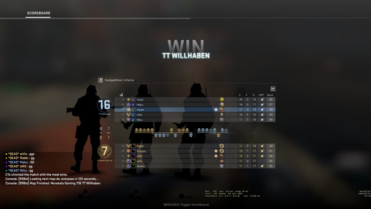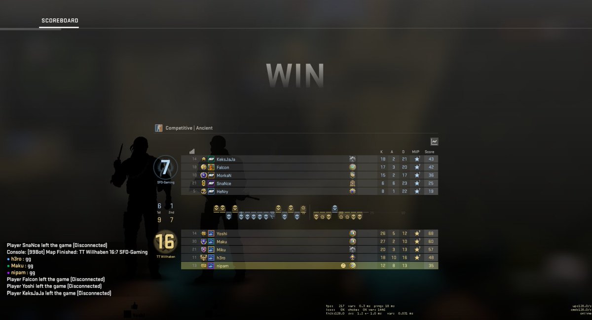 @HAVOC_GER (16-3 ancient, 6-16 inferno) atleast haben wir es schon geschaft, eine Map gut zu spielen. Mit dieser Pace sind wir dann in der Rele komplett da