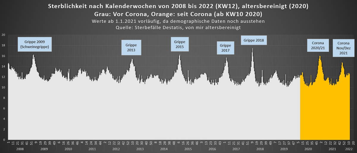 Hier die aktualisierten altersbereinigten wöchentlichen Sterblichkeiten, nun bis KW12.