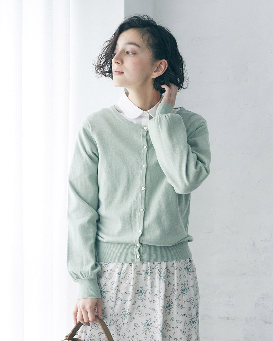 オーガニックコットン100%のカーディガン。高級感を感じる貝ボタンを使用し、お家で手洗いできるイージーケア仕様