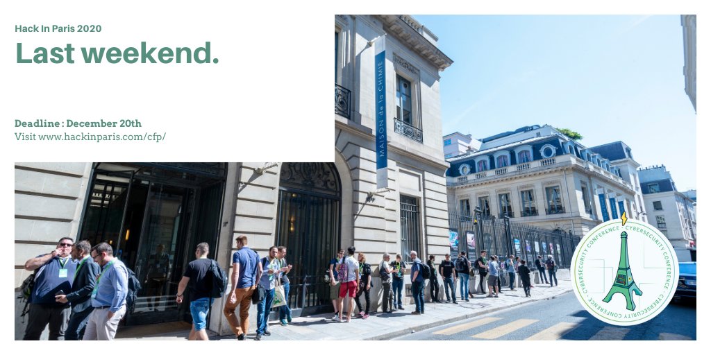 Hurry up, 3 days left to submit your paper for the next Hack In Paris ! https://www.papercall.io/hack-in-paris-2020 …pic.twitter.com/5woDH8WBDC