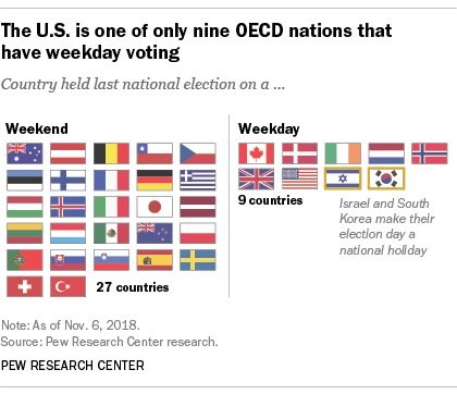 Unlike people in many other advanced industrial nations, Americans had to cast their vote during the work week. A look at the history that led to that https://pewrsr.ch/2D4R0Vq pic.twitter.com/elkc9vzQLj