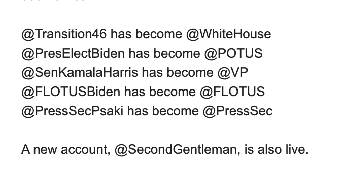 Twitter announces that the White House accounts have officially been transitioned from Trump to the Biden team - including, for the first time, a new account