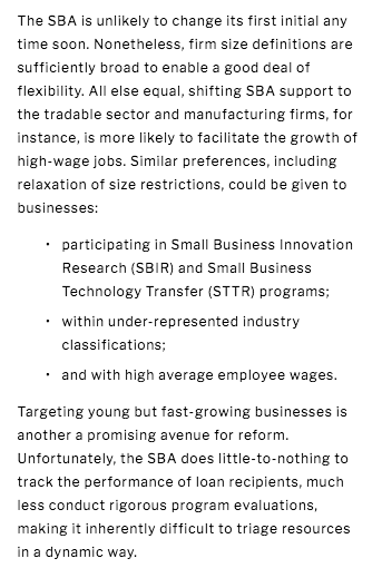 The 2nd problem is that SBA fails to measure performance. It's "job creation" numbers all come from loan applications. They measure *intent* rather than marginal impact. With data the SBA could identify fast growing businesses, and target support to new & high value activities.pic.twitter.com/M9r0H4pRgG