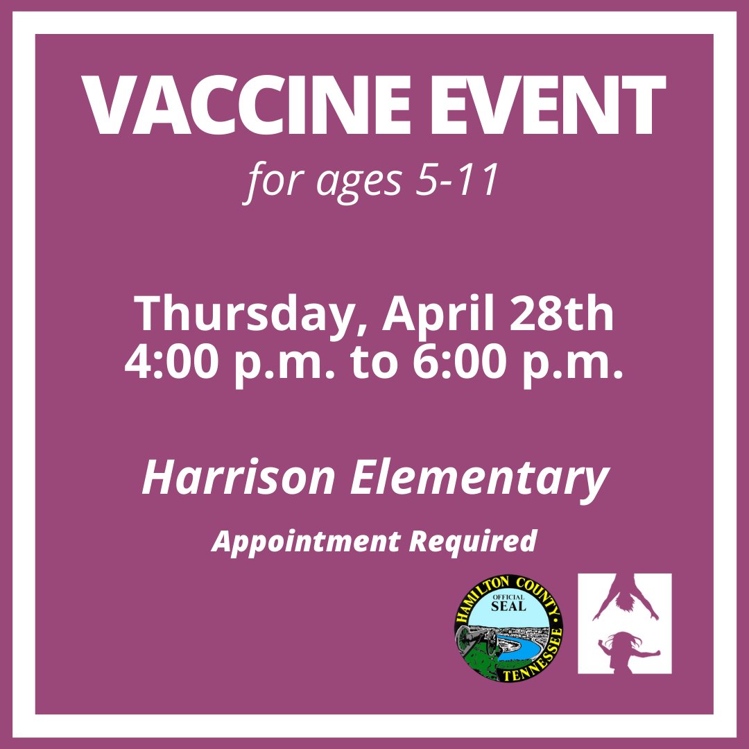 Join us for a Vaccine Event for ages 5 to 11! A parent or guardian must be present during the appointment. To schedule an appointment, visit https://bit.ly/April28VE or call (423)209-8383.pic.twitter.com/L979u1rACA