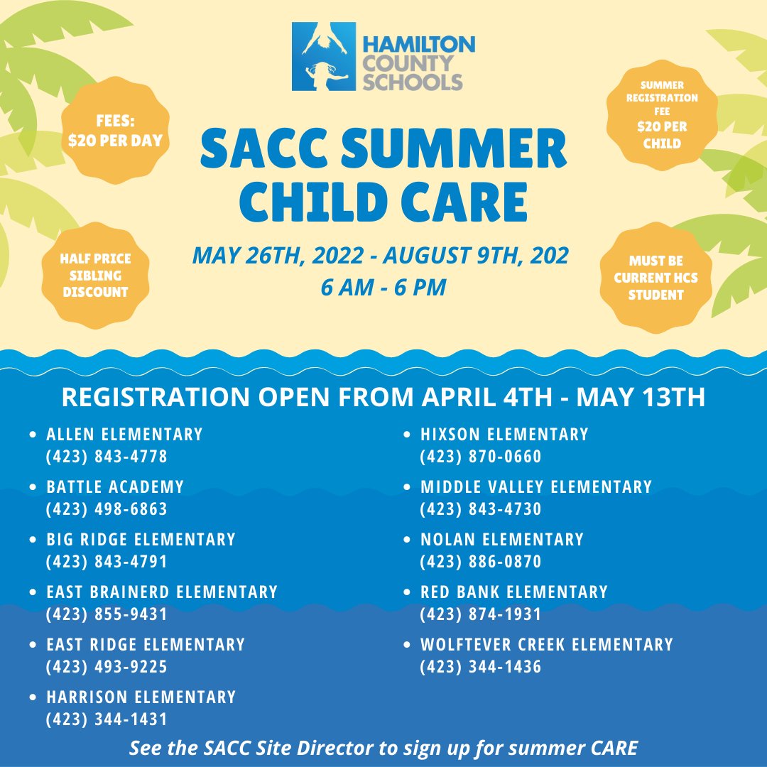 Summer registration for SACC is here!!The purpose of the SACC Program is to provide adult supervision for students during before and after school hours for students whose parents work outside the home. Registration deadline is May 13thpic.twitter.com/mFh3tpYweR