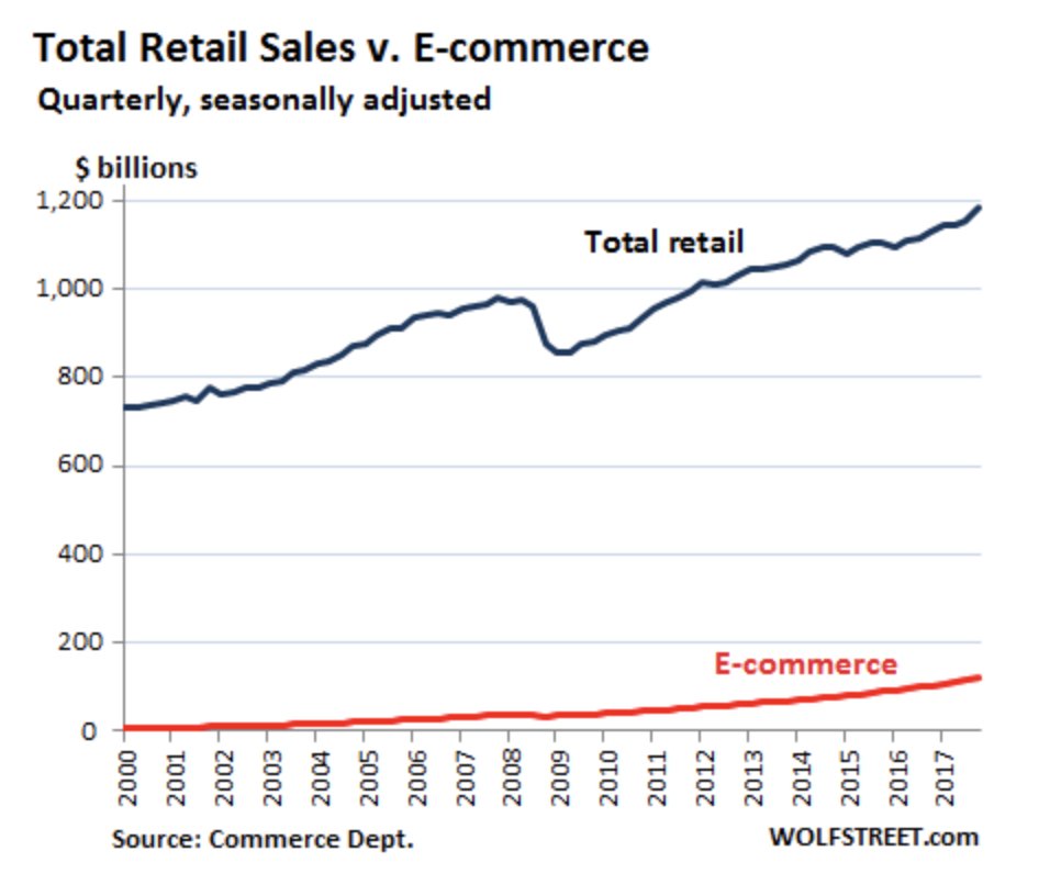 E-commerce sales in 4Q17 soared 16.9% from a year ago—largest jump since Q1 2012—to a new record of $119 billion. E-commerce share of retail reached 9.1%, up from 8.2% a year ago https://wolfstreet.com/2018/02/16/online-retail-soars-at-fastest-rate-in-years/ …pic.twitter.com/Lylp2u4OF8