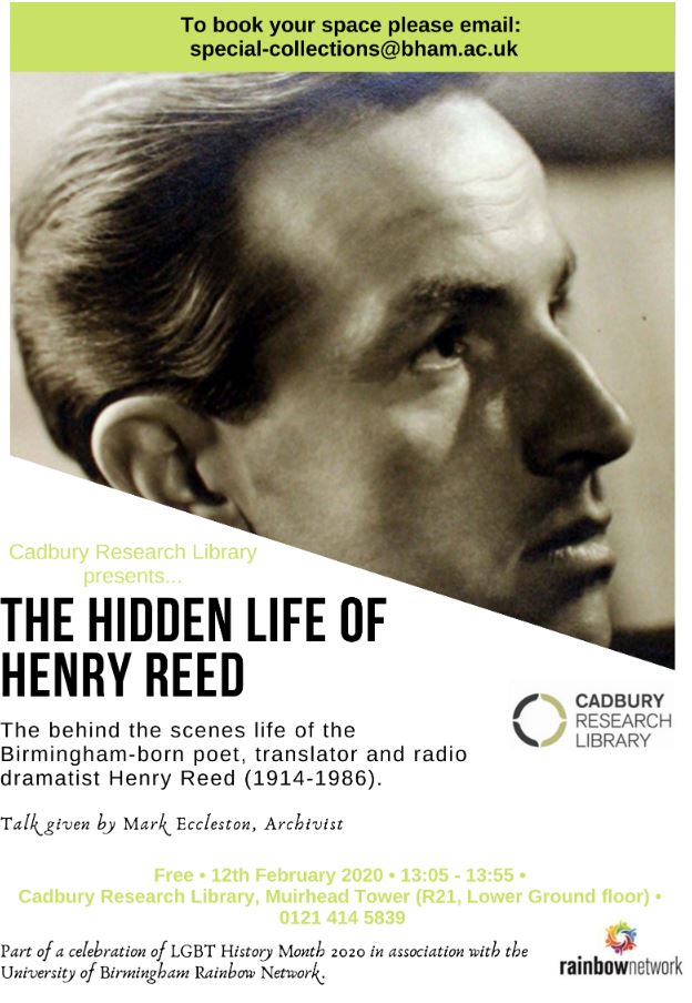 @CadburyRL for a talk titled 'The Hidden Life of Henry Reed' focusing on personal letters kept in Reed's archive. 13:05-13:55 on Wed 12 Feb 2020@CadburyRL. Booking essential. Further information: https://www.birmingham.ac.uk/events/lectures/The-Hidden-Life-of-Henry-Reed.aspx …pic.twitter.com/b291KQgjKC