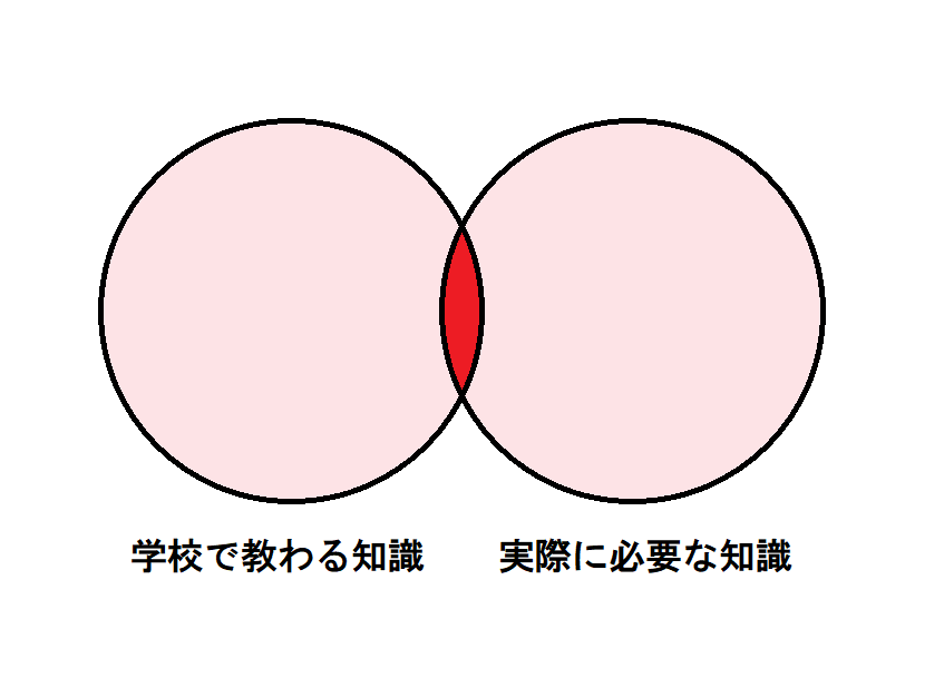 要するに、こういうことだと思います。 (実際には、円の大きさは異なるかもしれません。) これを『学校で教わる知識』と、『実際に必要な知識』のうち、 どちらを分母にして捉えるかで、真逆に見えてしまうということかと思います。 (引用元の方の場合は、学校側が分母)pic.twitter.com/7JCmS2HkHH