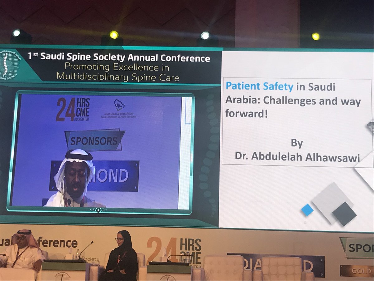 محاضرة مدير المركز - د. عبدالإله الهوساوي في المؤتمر الأول للجمعيه العمومية للعمود الفقري Lecture by Dr. Abdulelah Alhawsawi on the 1st Spine Society Annual Conference, Patient Safety in Saudi Challenges and Way Forward
