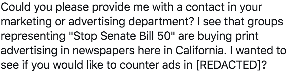 #SB50, newspapers are 'offering' us the opportunity to buy ads in support of SB 50. Help. https://secure.actblue.com/donate/cayimby pic.twitter.com/Gmo6z8JpnI