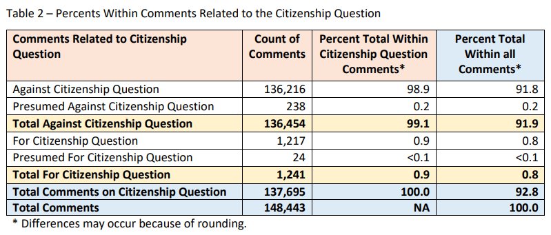 JUST IN: About 99 percent of the close to 138,000 public comments about the #2020census #citizenshipquestion the @CommerceGov Department has received are AGAINST the question, according to new @uscensusbureau analysis👇 https://www.regulations.gov/document?D=USBC-2018-0005-79003 …pic.twitter.com/BkpyFLdHEt