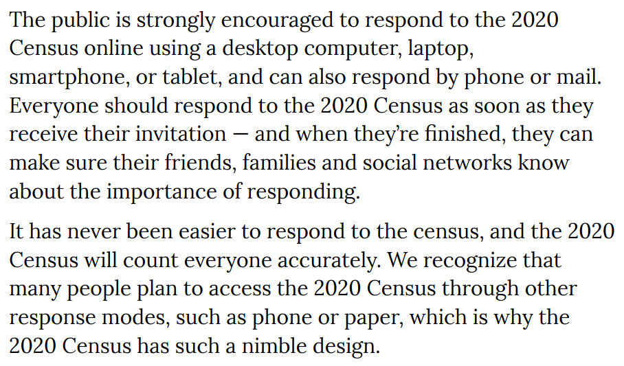 3. While field operations are temporarily suspended, the Census Bureau is continuing to encourage households to respond on their own now either at http://my2020census.gov , 1-844-330-2020 or by paper form (if they get one)