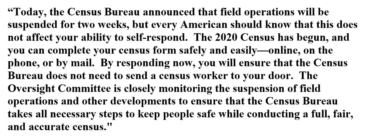 4. "By responding now, you will ensure that the Census Bureau does not need to send a census worker to your door," @RepMaloney (D-N.Y.), House @OversightDems chair, says in statement encouraging households to do #2020Census on their own during temporary pause in field operationspic.twitter.com/oa5QkaPf3M