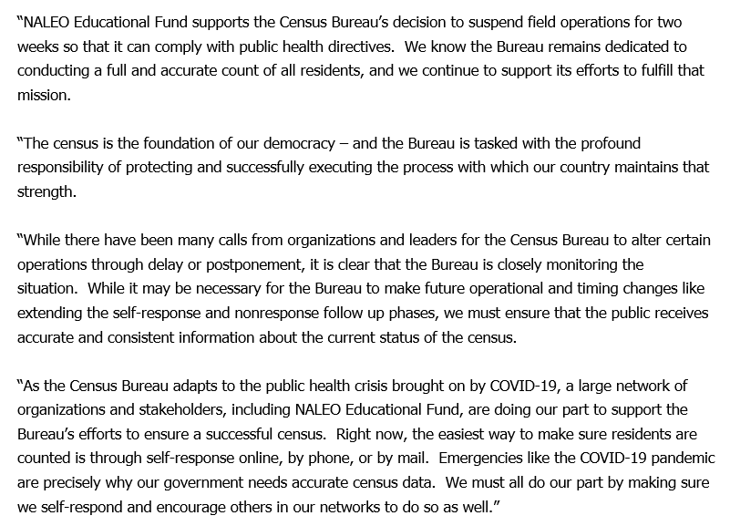 6. @ArturoNALEO says @NALEO supports the Census Bureau's decision to temporarily suspend #2020Census field operations until April 1, but adds it's important to "ensure that the public receives accurate and consistent information about the current status of the census."pic.twitter.com/X7PzEysxW0
