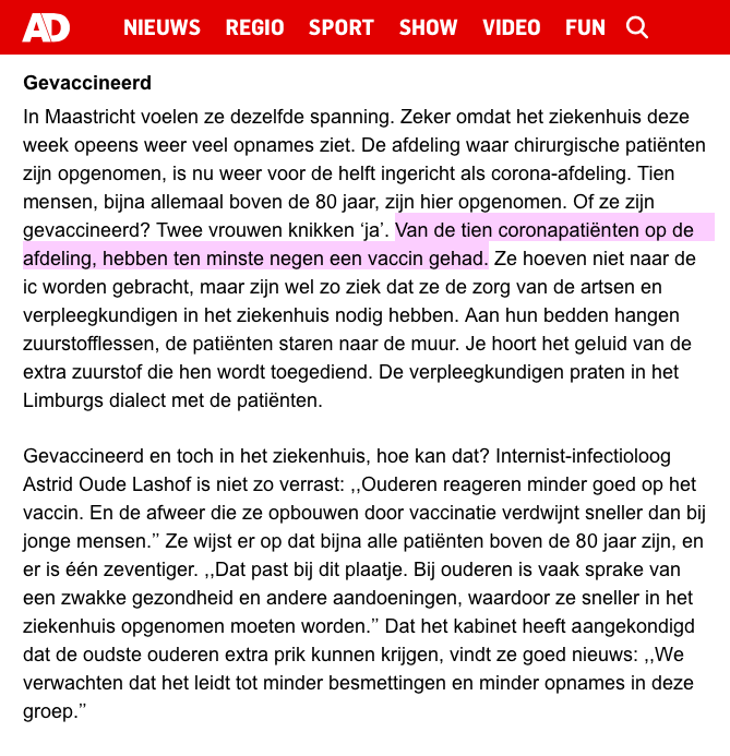 In Maastricht UMC, afgelopen week, waren minstens 9 van de 10 patiënten op de Covid-afdeling (niet IC) gevaccineerd. En zowat allemaal ouder dan 80. Heel vreemd om dan jongere en niet verzwakte mensen en kinderen de vaccins aan te praten omdat ze de IC's zouden gaan bezetten.pic.twitter.com/C716Cr6bhR