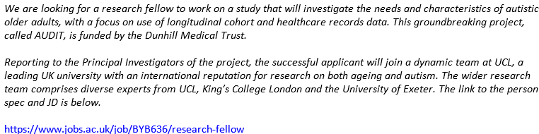 Post-doc Research Fellow opportunity working on ageing, autism and autistic traits with