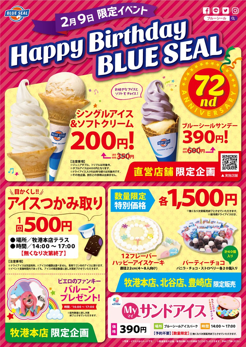2/9日はブルーシール72歳の誕生日! 創業イベントを開催! 9日限定 直営店舗 シングルアイス・ソフトクリーム 200円 牧港本店限定 アイスの掴み取り! 無くなり次第終了 大型3店舗 数量限定でアイスケーキ、パティ-チョコ 特別価格¥1,500円 詳しくは↓ https://www.blueseal.co.jp/recommend_news/7440.html …