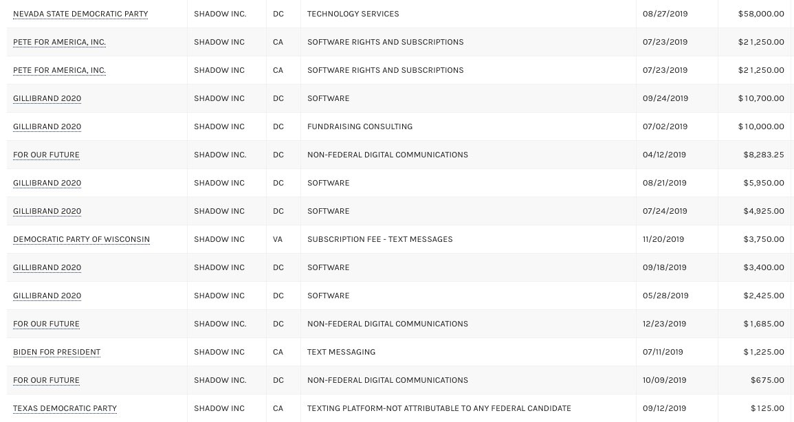 "Shadow Inc"—a previously undisclosed caucus vendor Iowa's Democratic Party kept secret that supposedly created IA caucuses' app—is an appendage of "dark money" group ACRONYM & has "other private investors." FEC filings show it paid by Joe Biden & Pete Buttigieg's 2020 campaigns https://twitter.com/emilybell/status/1224569050870751232 …pic.twitter.com/i3zJr3d3vt