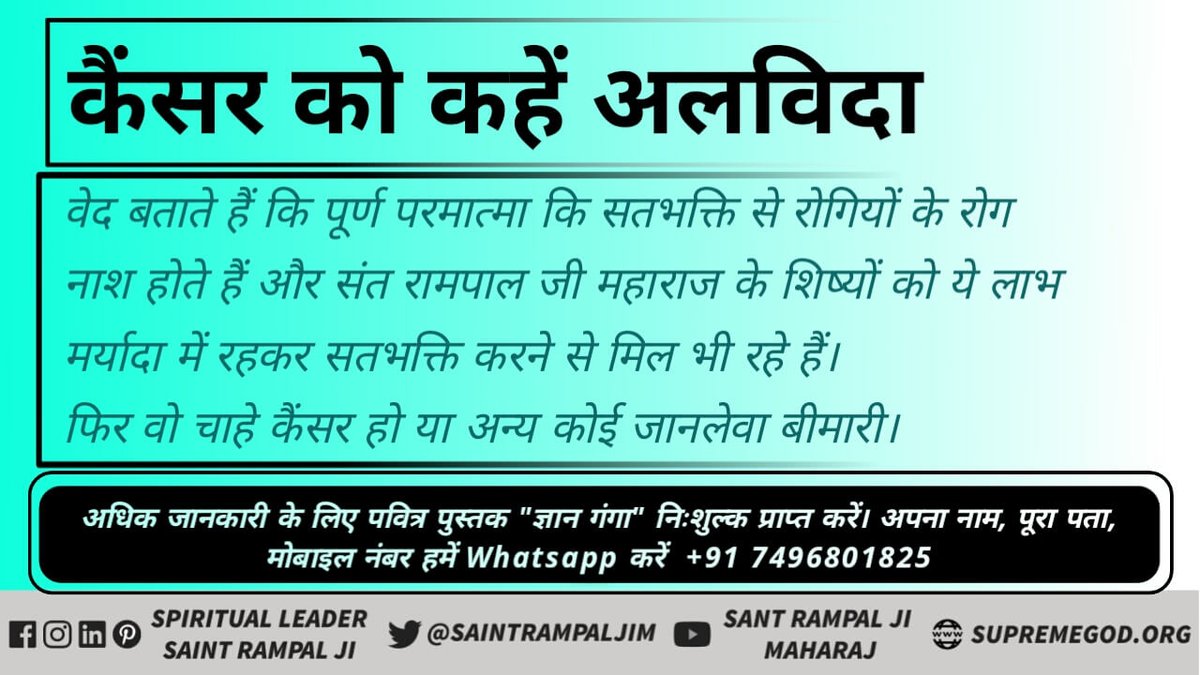 @SaintRampalJiM In his spiritual discourses, it is said that by living in true devotion to the Supreme God, cancer or any incurable disease is cured with 100% guarantee.#CureCancer_By_TrueWorshippic.twitter.com/ZOdvtKC1ij