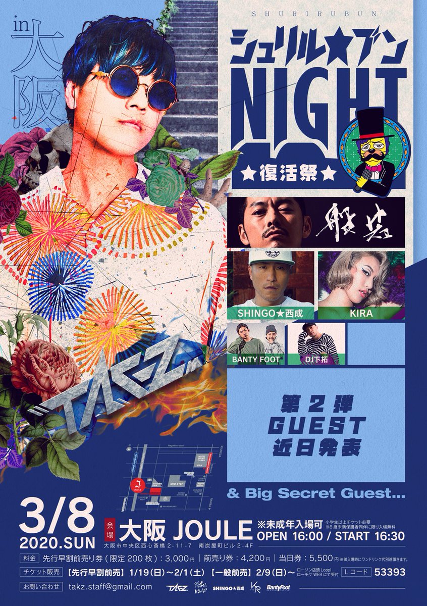 シュリル☆ブンnight〜復活祭 in 東京〜 【公演日】3月20日 (金) 【会場】東京渋谷 HARLEM 【開場/開演】 OPEN 16:00 / START 16:30 【料金】¥3,000 【先行早割前売チケット】 受付期間:1/24(金)19:00〜2/6(木)23:59 購入はこちら https://l-tike.com/shurirubun