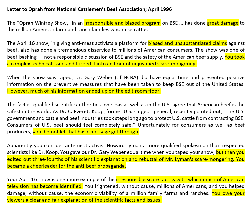 When Oprah faced criticism over using her platform to unjustly tarnish reputations (from individuals to industries) she'd retort with "my show isn't the evening news - freedom of speech!" Here is a letter sent to her from the president of NCBA in 1996 about her reckless conduct.pic.twitter.com/J2Heyk5qNJ