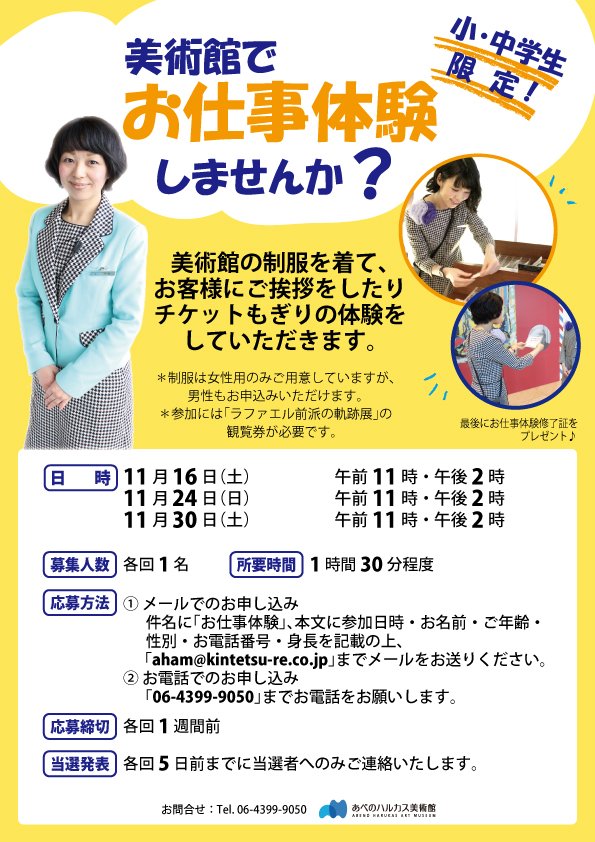 【お仕事体験】 あべのハルカス美術館では定期的に小・中学生の方に美術館のお仕事を体験いただくイベントを行っています! 本日もチケットもぎりや案内などを頑張っていただきました♪ 今月30日(土)の11時・14時の回はまだ空きがございます。 詳しくは画像をご覧ください♪ご応募お待ちしております!pic.twitter.com/AU55lnEqDx