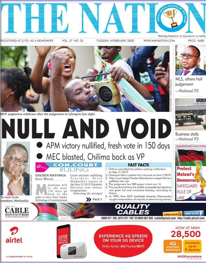 #Lilongwe Malawi’s Constitutional Court annulled the May 2019 presidential vote that declared Peter Mutharika a winner. Court has ordered a re-run Video credit@cyrus_nhara#Malawi#JudgementDaypic.twitter.com/h16ERdfRCaHvala. Twitter će to iskoristiti za poboljšanje vaše vremenske crte. PoništiPoništi -