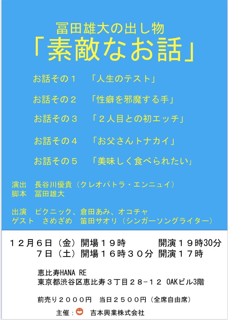 『素敵なお話』初日終了しました。 来てくださったかたがたありがとうございます。変なアドレナリンが出て最高に楽しかったです。素敵なお話と言いつつ、人間の深い部分や下ネタや恋愛などすべて楽しめます。明日は最終日。チケット完売してるけど、当日券あるみたい。今日のピクニックさんを添えて。pic.twitter.com/4p7wAf5Imq