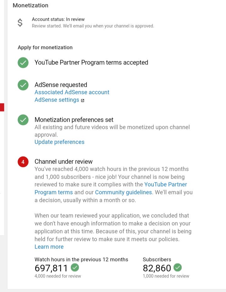 If you haven't heard back, this means the review team didn't reach a clear decision during the 1st review, so we’re putting extra effort & resources into reviewing your channel before making a final decision. Check out our YPP Policies and learn more here: https://yt.be/help/YPP-review