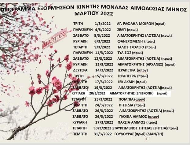 Το πρόγραμμα εθελοντικών αιμοδοσιών για το μήνα Μάρτιο της υπηρεσίας αιμοδοσίας του νοσοκομείου Ηρακλείου Κρήτης "Βενιζέλειο"!