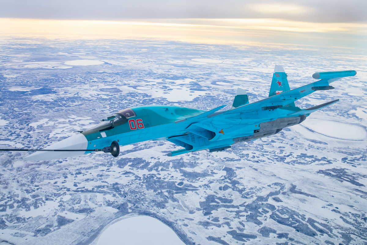 Вираж Су-34 перед стыковкой с воздушным танкером для дозаправки в небе над Уралом