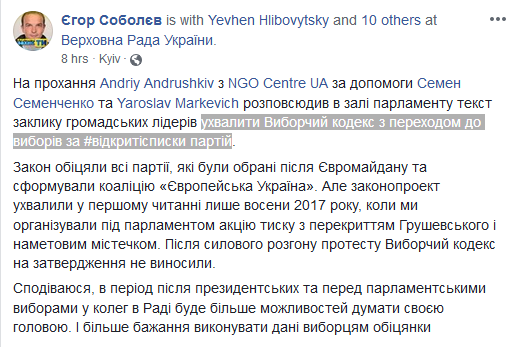 В Верховной Раде Егор Соболев инициировал поднятие вопроса о принятии во втором чтении закона об