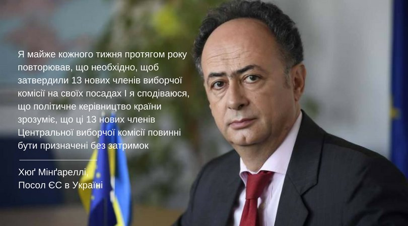Посол ЄС Хьюг Мінгареллі закликав невідкладно призначити членів ЦВК - https://goo.gl/Cs5G1R . Крім того, посол зазначив, що ЄС буде стежити за прийняттям проекту виборчого кодексу.