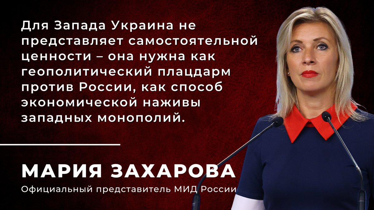 #Захарова: Для Запада Украина не представляет самостоятельной ценности – она нужна как геополитический плацдарм против России.