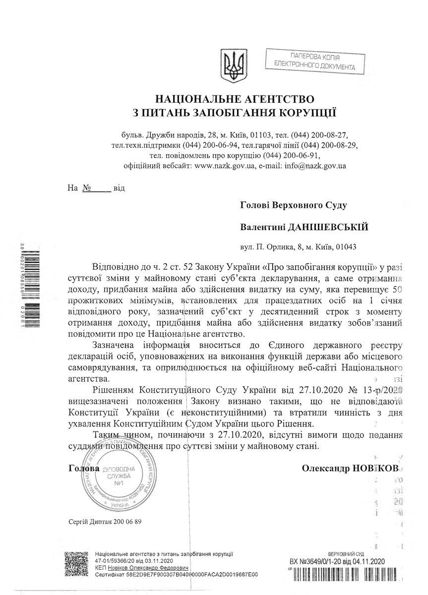 Лист Голови Національного агентства з питань запобігання корупції до Голови Верховного Суду щодо особливостей декларування: http://bit.ly/38hoYFQ