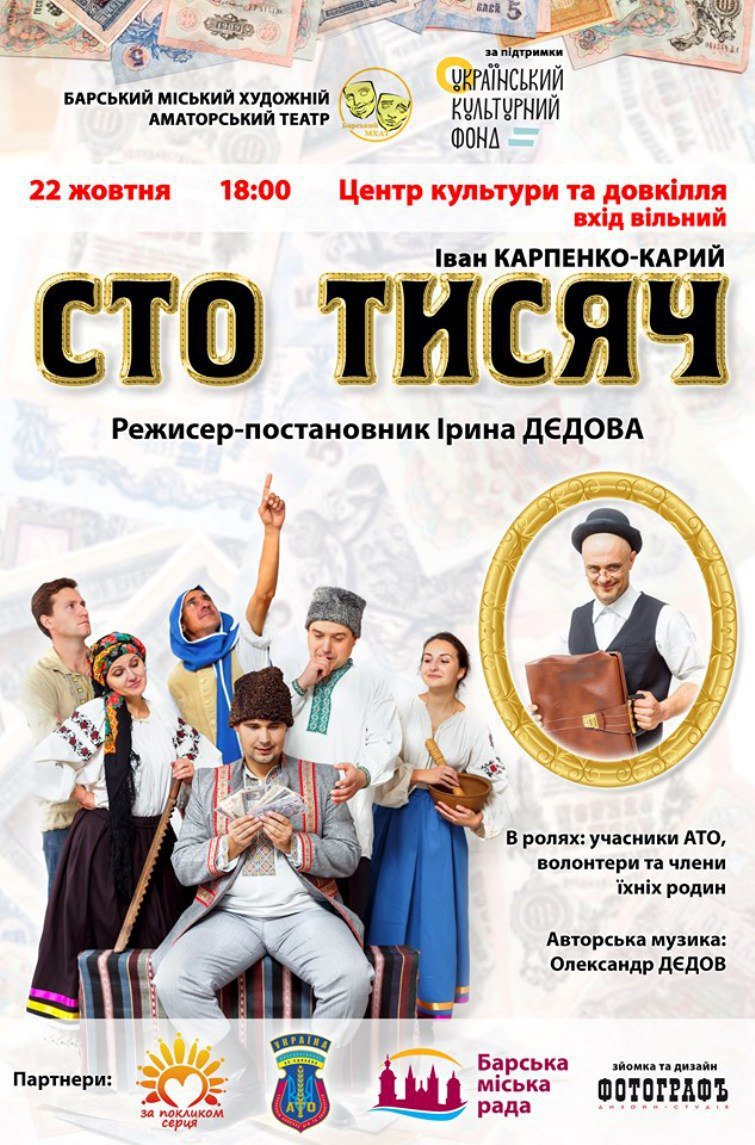 #Славянск Слов'янськ 22.10.2019 р, 18.00 Центр культури та довкілля В рамках реалізації проекту реабілітації учасників АТО засобами театрального мистецтва - вистава "Сто тисяч" У ролях аматори учасники АТО, волонтери та члени їх родин. Вхід вільний! pic.twitter.com/AEaSLiNvKE