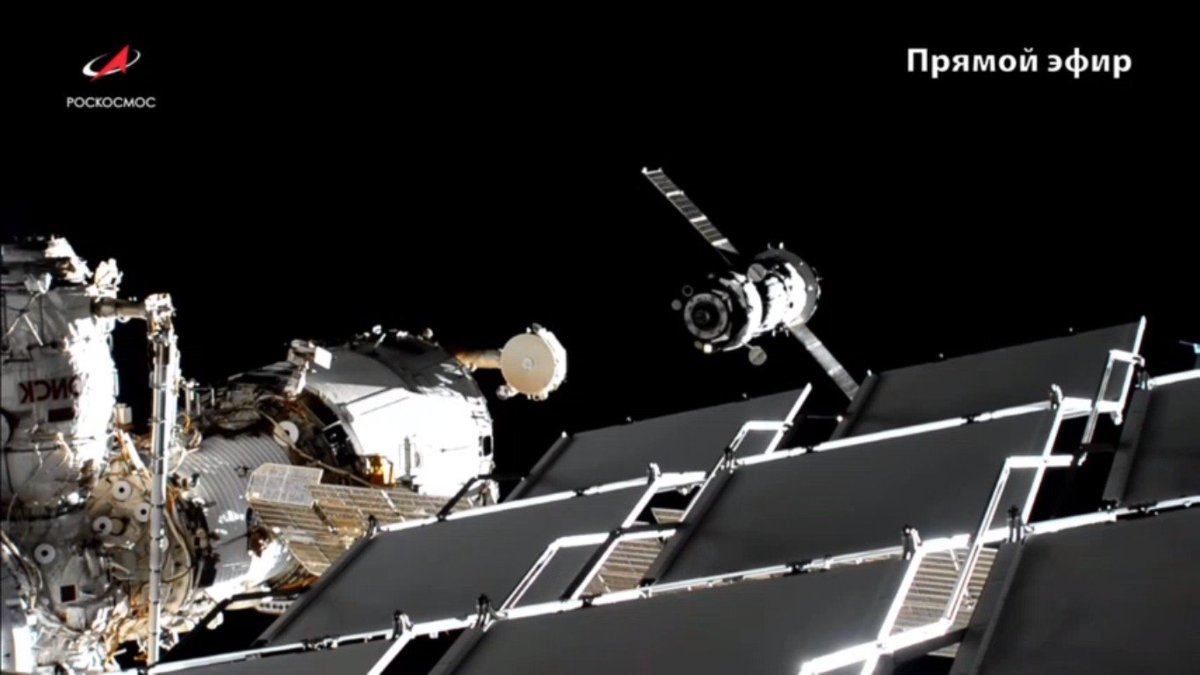 Корабль «Союз МС-14» успешно пристыковался к российскому сегменту Международной космической станции. Экипаж готовится к открытию переходных люков между кораблём и станцией.