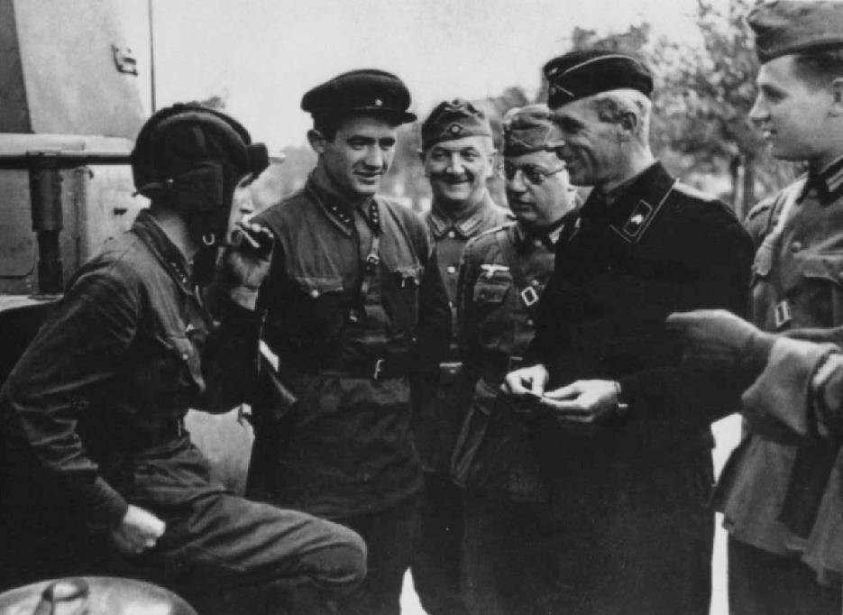 Открытка ватникам. Польша, 1939. Красный комиссар бухает с офицером Вермахта