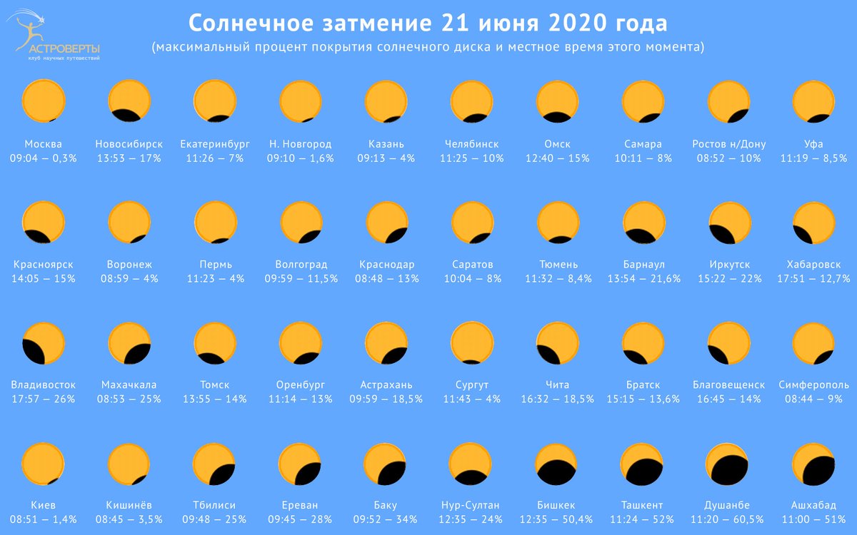 21 июня 2020 года произойдет #солнечноезатмение , которое будет видно в России. Ребята из AstroAlert создали инфографику на которой видно где, во сколько и сколько процентов затмения можно будет наблюдать.