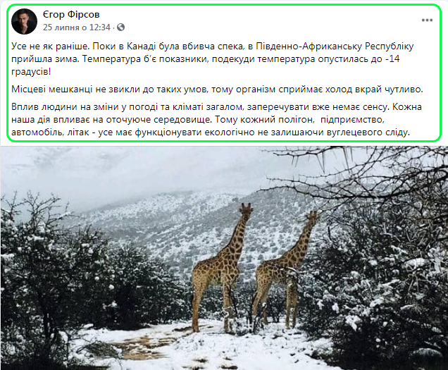 Цьогоріч усе не, як раніше. Доки в Канаді була вбивча спека, в Південно-Африканську Республіку прийшла зима. Температурні показники б’ють рекорди, подекуди температура опустилась до -14 градусів!