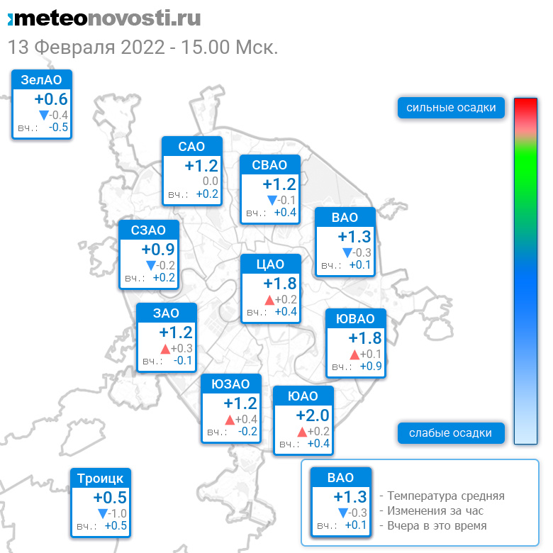 В 15:00 в Москве было от +0.1°C до +2.6°C, средняя температура +1.2°C