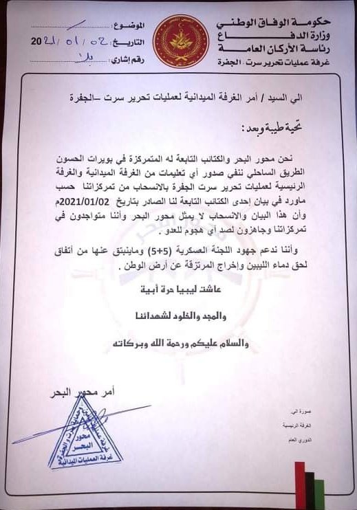 #ليبيا | أمر محور البحر والكتائب التابعة له ينفي صدور أي تعليمات من الغرفة بالانسحاب من تمركزاتها ، وأنهم متواجدون وجاهزون لصد أي هجوم للعدو ، وأنهم يدعمون جهود لجنة (5+5) لحقن الدماء وإخراج#المرتزقة، وأن من انسحب لا يمثل محور البحر . pic.twitter.com/Yl4KgeXVHa