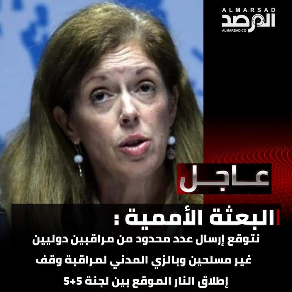 عاجل > البعثة : نتوقع إرسال عدد محدود من مراقبين دوليين غير مسلحين وبالزي المدني لمراقبة وقف إطلاق النار الموقع بين لجنة 5+5.