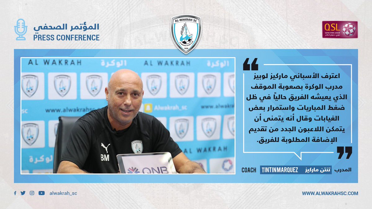 | اعترف الأسباني ماركيز لوبيز مدرب الوكرة بصعوبة الموقف الذي يعيشه الفريق حاليًا في ظل ضغط المباريات واستمرار بعض الغيابات وقال أنه يتمنى أن يتمكن اللاعبون الجدد من تقديم الإضافة المطلوبة للفريق.