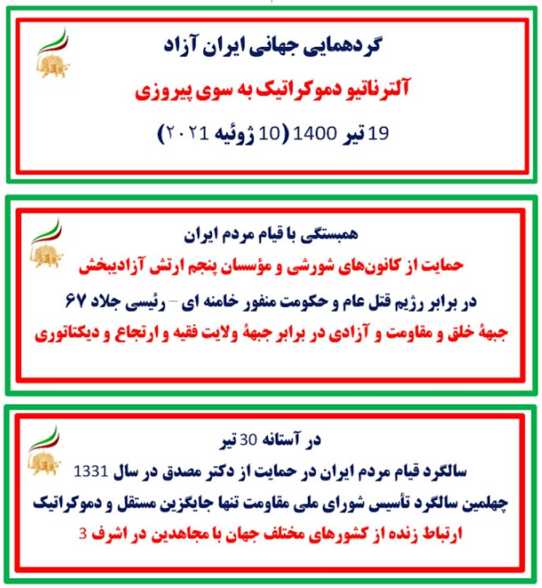 گردهمایی جهانی ایران آزاد - آلترناتیو دمکراتیک به سوی پیروزی - ۱۹تیر۱۴۰۰ (۱۰ژوئیه ۲۰۲۱) دوستان اطلاع رسانی کنید